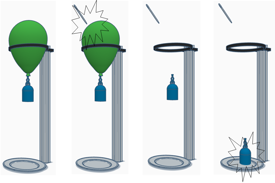 Budeme postupovat podle schématu na Obr. 1. Nafoukneme balonek a přiděláme na něj závaží. Vložíme ho do obruče, která je přidělaná na stojánku. Změříme výšku závaží nad podlahou.