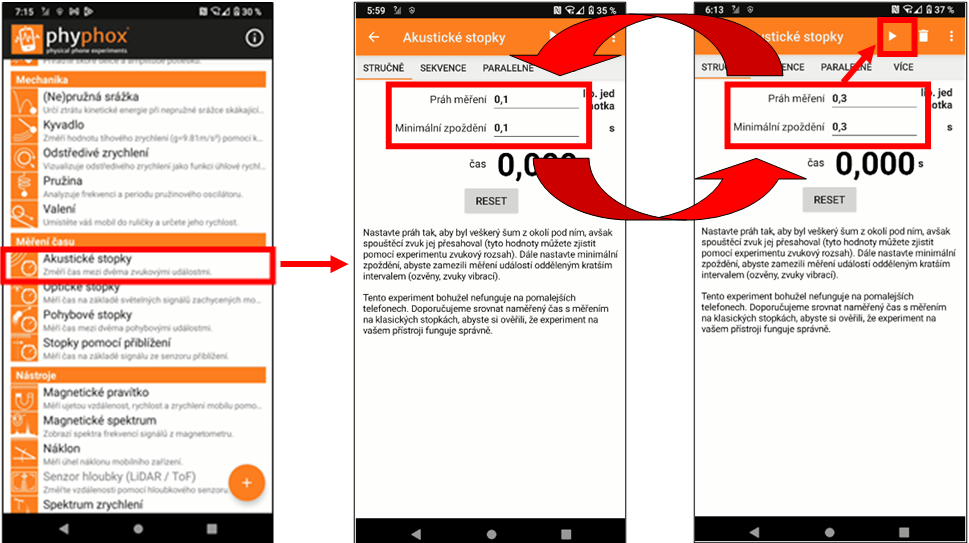 Nyní otevřeme aplikaci Phyphox (Obr. 2), kde spustíme funkci "Akustické stopky", přejdeme do záložky "Stručně" a stopky spustíme pomocí tlačítka "Play" v horní levé části. Pokud se nám stopky samy od sebe spouští, musíme zvýšit "Práh měření". Dále nastavíme "Minimální zpoždění", a to podle výšky balonku (zde pracujeme podle zkušeností, popř. si musíme rychle spočítat, jak dlouho by měl pád trvat a hodnotu nastavit těsně pod ním). To děláme z důvodu, aby se nám stopky nezapínaly/nevypínali kvůli odrazům zvuku od stěn.