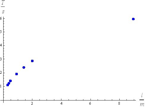 Před tím, než ukážete žákům vzorec, který udává závislost periody kyvadla na jeho délce, můžete jim dát úkol na doma, ve kterém si sestaví své vlastní kyvadlo, u kterého změří jeho délku a periodu kmitání. Ve škole pak dáte dohromady výsledky všech studentů a zanesete je do grafu. Můžete pak diskutovat, jaká je závislost periody kmitání na délce (Obr. 2).
