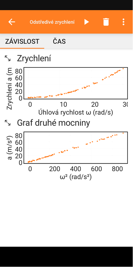 Jakmile spustíme experiment, můžeme začít roztáčet odstředivku na salát a pozorovat grafy, které se nám tvoří. Postupně můžeme zvyšovat / snižovat rychlost otáčení, abychom zaplnili co nejvíce bodů. Aplikace průměruje data po 0,5 sekundách, aby se snížil vliv nerovnoměrností pohybu. Po ukončení měření prozkoumejte se studenty horní graf, kde x-ová osa představuje úhlovou rychlost ω a y-ová osa naměřené hodnoty zrychlení a. Ideální graf by měl ukazovat kvadratickou závislost (Obr. 3). To, jestli je závislost opravdu kvadratická, je ukázáno i na spodním grafu, kde x-ová osa ukazuje druhou mocninu úhlové rychlosti, tudíž by body měly ležet na přímce.