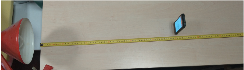 Umístěte světelný zdroj na pevnou pozici a zajistěte jej (uspořádání pokusu je zobrazeno na Obr. 1). V chytrém mobilu spusťte aplikaci Phyphox a zvolte experiment "Světlo". Přejděte na záložku "Stručně". Přibližujte nebo vzdalujte (podle původního umístění) chytrý telefon od zdroje světla. V určitých intervalech (např. po třech cm) vzdálenosti odečtěte hodnotu intenzity světla zobrazenou aplikací. Dejte si pozor, aby senzor intenzity světla vždy směřoval ke zdroji světla.