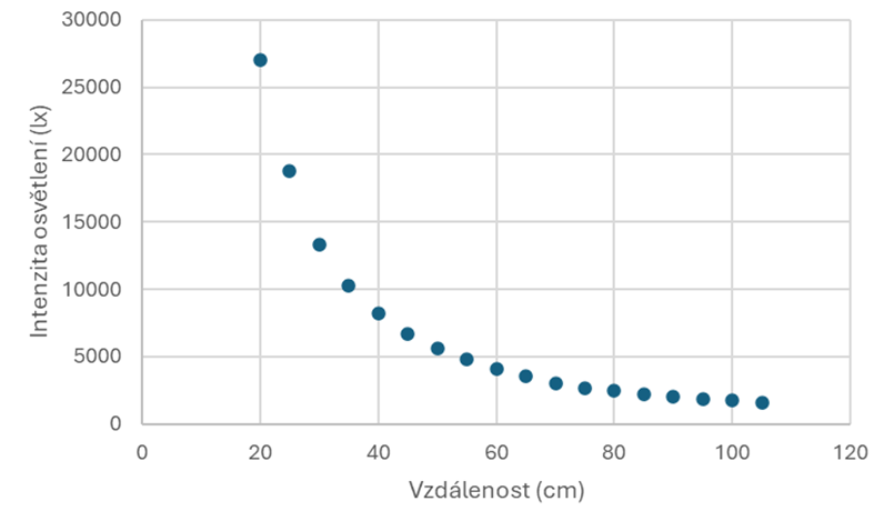 Obrázek 2. Závislost intenzity osvětlení na vzdálenosti od žárovky.